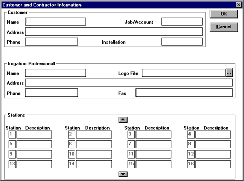 After choosing "Create a New Setup", the "Customer and Contractor Information" screen will appear. This is an optional section that allows the irrigation professional to create a door reference chart that can be used later for quick reference. Fields are provided for both customer and contractor contact information. The contractor company logo can also be entered so that it prints on the top of the form. (Logo must be 100 X 100 pixels, .83 in. x .83 in., or 2.11 cm. x 2.11 cm.) In addition to information about the customer and contractor, there is also space for a short description of each of the stations. The chart can then be printed out and stored close to the controller for later reference. Click on OK to continue or when form is complete.