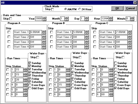 The Setup All option gives you a handy way to view all programs, start times, run times, and water days on a single screen. If you choose, you can make schedule changes here, or use the individual menu items. You can view and make changes to each program's start times, run times, and water days here. Also, you can change the clock mode and date. (Figure 6)
