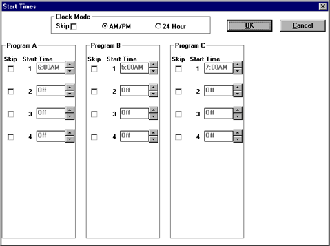 Note: A skip function is available for each field. This function is helpful when making revisions to an existing program. By selecting skip for a specific item, the data will not be changed in the controller when the new program is uploaded into the controller. For example, the SRP will automatically change the time on the controller to the time when the new program was downloaded to the SRP module. To prevent changing the time, selecting skip for the clock mode would be recommended. |