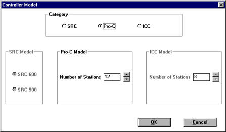 If you selected "Create a New Setup" the program will automatically take you through all the steps you will need to setup a complete program. If you would like to setup your controller in a different manner, you can click Cancel at any time to go to the main screen. To set up a schedule for an SRC, choose SRC , then model 600 (six-station) or 900 (nine-station). For the Pro-C, click on Pro-C, and then specify the number of stations, from 3 to 12. For the ICC, click on ICC, and then specify the number of station, from 8 to 48. When you're done, choose OK. You're now ready to set up a schedule for the controller model you've selected.