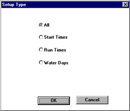 On the Setup Type screen you can choose whether to setup all your program information together or separately. Your choices are Setup All, Start Times, Station Run Times, or Water Days. (Figure 5)